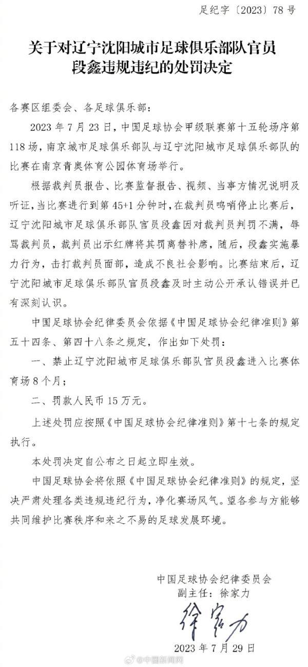 中国足协网站2日发布处罚决定,此前在比赛中掌掴裁判的辽宁沈阳城市足球俱乐部队官员段鑫被禁止进入比赛体育场8个月,罚款人民币15万元。足协在处罚决定中称,段鑫因对裁判员判罚不满,辱骂裁判员,裁判员出示红牌将其罚离替补席,随后,段鑫实施暴力行为,击打裁判员面部,造成不良社会影响。
