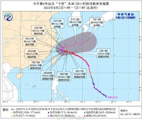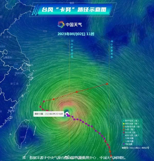 今年第6号台风“卡努”(KHANUN)(超强台风级)的中心今天(2日)上午8点钟位于浙江省玉环市东偏南方向约610公里的东海海面上,就是北纬25.7度、东经126.8度,中心附近最大风力有16级52米/秒),中心最低气压为935百帕,七级风圈半径300-360公里,十级风圈半径100公里,十二级风圈半径50公里。