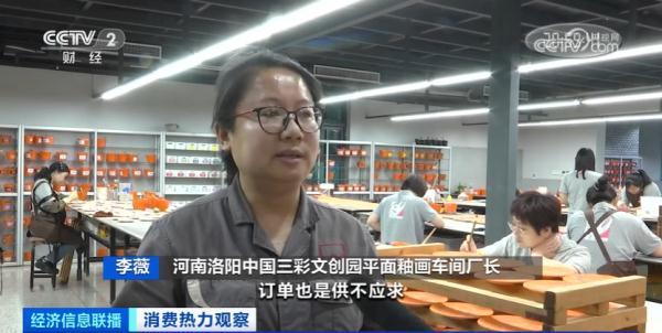 文创产品热销也让产业链不断升温,一些工厂加班赶订单成为常态,在河南洛阳的中国三彩文创园,一个生产车间的工人给文创产品喷釉、上色。在他们手中,三彩不仅可以做成精致艳丽的摆件,也可以做成实用的笔筒、花器、茶台等产品。