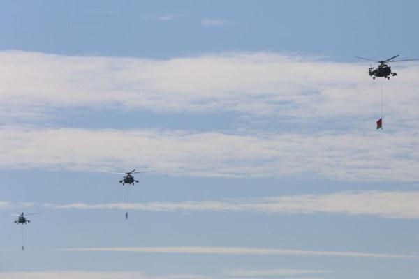 这是2017年5月20日在白俄罗斯首都明斯克拍摄的展会开幕式上的直升机表演。新华社记者魏忠杰摄