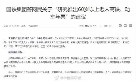据中国政府网8月1日消息,国铁集团近日答复网民关于“研究推出60岁以上老人高铁、动车年票”的建议。一位来自福建厦门的网民提出:可以研究60岁以上老年人购买高铁、动车的年票(如3000元/张,节日除外、不含星期六星期天)。