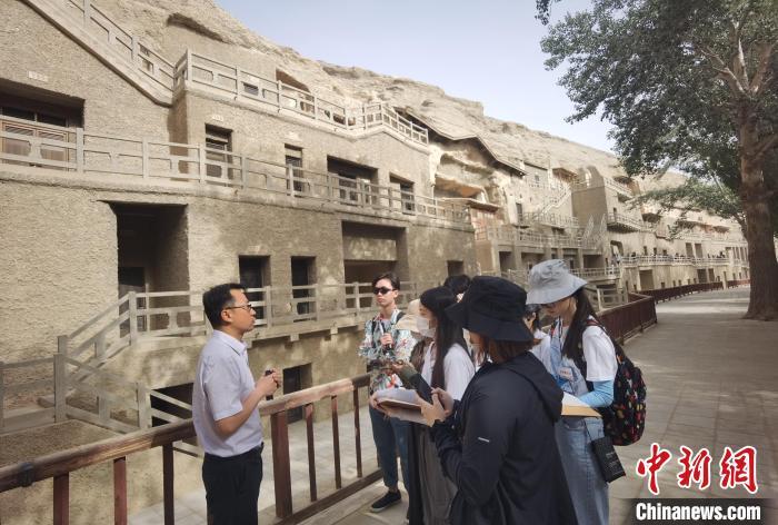 在为期六周的时间里,学生们与当地专家学者交流,在专家的指导下参观莫高窟和石窟复修工程,完成相关课程培训并通过考核后,还当上了莫高窟见习讲解员,为游客导览。