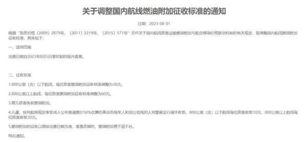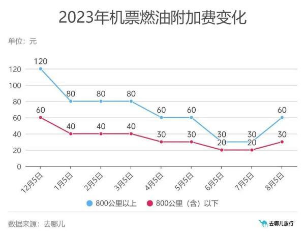 自2023年8月5日(出票日期)起,成人旅客800公里(含)以下航线每位旅客收取30元燃油附加费,800公里以上航线每位旅客收取60元燃油附加费。