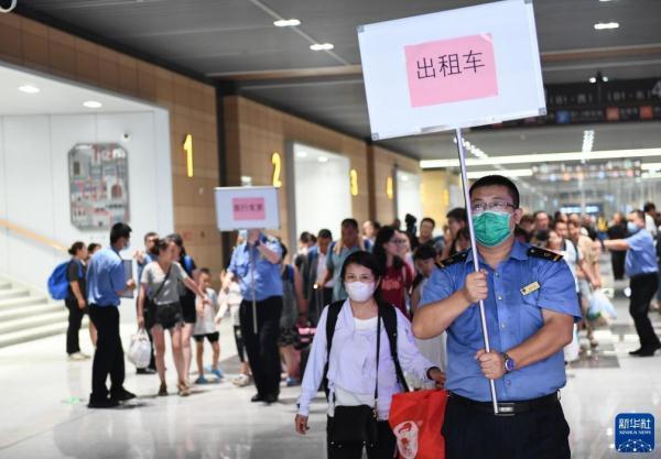 8月2日,北京丰台站工作人员引导K396次列车旅客有序出站。