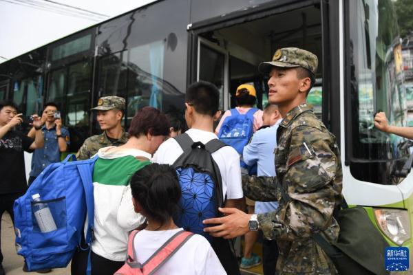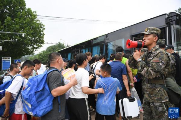 8月2日,在北京市门头沟区妙峰山镇政府附近,武警北京总队机动三支队官兵引导旅客排队乘坐大巴车转移。