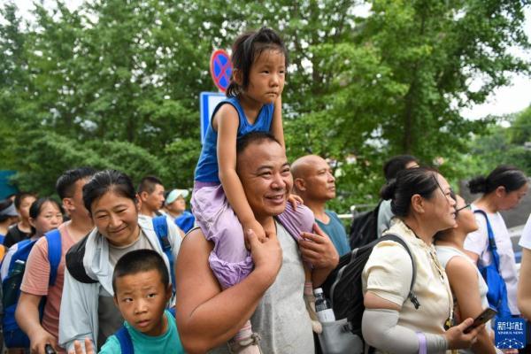 8月2日,在北京市门头沟区妙峰山镇政府附近,旅客排队准备乘坐大巴车。