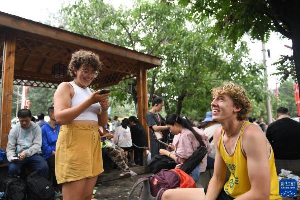 8月2日,在北京市门头沟区妙峰山镇政府附近,K396次列车旅客、来自德国的富克斯(左)和海因克在与家人联系报平安。