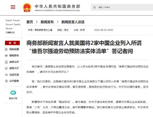 商务部新闻发言人就美国将2家中国企业列入所谓“维吾尔强迫劳动预防法实体清单”答记者问
