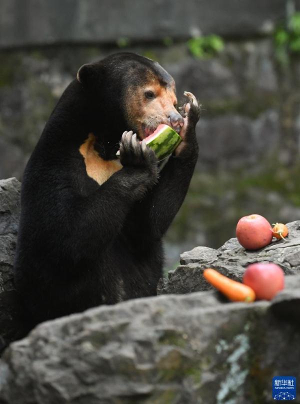 8月2日,马来熊在杭州动物园享用水果。