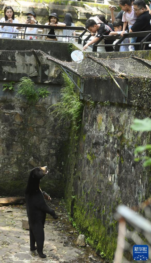 8月2日,马来熊在杭州动物园“直立”与游客互动。