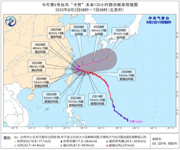 中央气象台2日10时继续发布台风蓝色预警。今年第6号台风“卡努”(超强台风级)的中心2日8时位于浙江省玉环市东偏南方向约610公里的东海海面上(北纬25.7度、东经126.8度),中心附近最大风力有16级(52米/秒)。