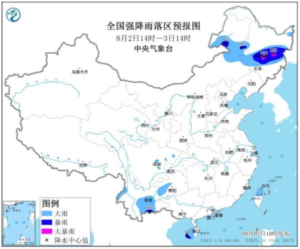 中央气象台2日10时继续发布暴雨蓝色预警。预计,2日14时至3日14时,内蒙古东北部、黑龙江南部、吉林西部和北部以及四川盆地西南部、贵州西部、云南中南部、海南岛中西部、台湾岛北部等地部分地区有大到暴雨,其中,黑龙江东南部、吉林北部等地的局部地区有大暴雨。上述部分地区伴有短时强降水,局地有雷暴大风、冰雹等强对流天气。