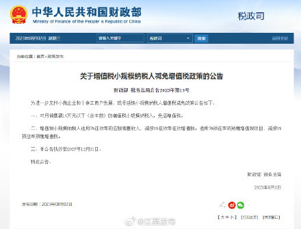 据财政部网站8月2日消息,财政部、税务总局发布《关于增值税小规模纳税人减免增值税政策的公告》,为进一步支持小微企业和个体工商户发展,将延续小规模纳税人增值税减免政策。公告如下:对月销售额10万元以下(含本数)的增值税小规模纳税人,免征增值税。增值税小规模纳税人适用3%征收率的应税销售收入,减按1%征收率征收增值税;适用3%预征率的预缴增值税项目,减按1%预征率预缴增值税。本公告执行至2027年12月31日。