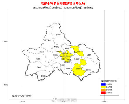 @成都气象8月3日9时40分发布暴雨黄色预警信号:预计未来6小时,成都市锦江区、青羊区、金牛区、武侯区、成华区、青白江区、东部新区、高新西区和高新南区的所有乡镇(街道)降雨量将达50毫米以上。请注意防范暴雨、雷电和阵性大风带来的不利影响。