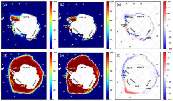 我国风云系列气象卫星监测的南极月平均海冰密集度:(a) 2012−2021年平均的2月海冰密集度 (b)2022年2月海冰密集度 (c) 2022年2月海冰密集度距平 (d) 2012−2021年平均的9月海冰密集度 (e)2022年9月海冰密集度 (f) 2022年9月海冰密集度距平。