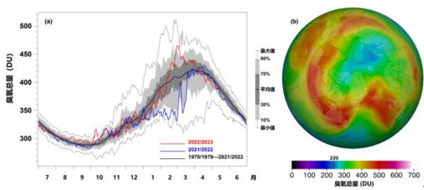 (a)北极(63°N以北)臭氧总量季节变化,红色为2022年下半年到2023年上半年,蓝色为2021年下半年到2022年上半年,黑色为1978−2021年气候态平均(b)2022年北极臭氧损耗空间分布,其大致为蓝色区域。