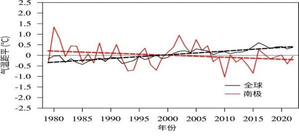 1979−2022年南极(红线实线)和全球(黑线实线)平均近地面年平均气温距平(相对于1991−2020年),虚线为年平均气温距平趋势。