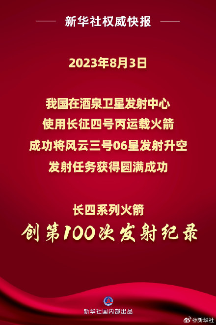 8月3日11时47分,我国在酒泉卫星发射中心使用长征四号丙运载火箭,成功将风云三号06星发射升空,卫星顺利进入预定轨道,发射任务获得圆满成功。本次发射是长征四号系列运载火箭第100次发射,创造了我国运载火箭发展历程中又一个百发纪录。风云三号06星的成功发射开启我国风云卫星紫外高光谱探测新篇章。(记者:宋晨黄垚)