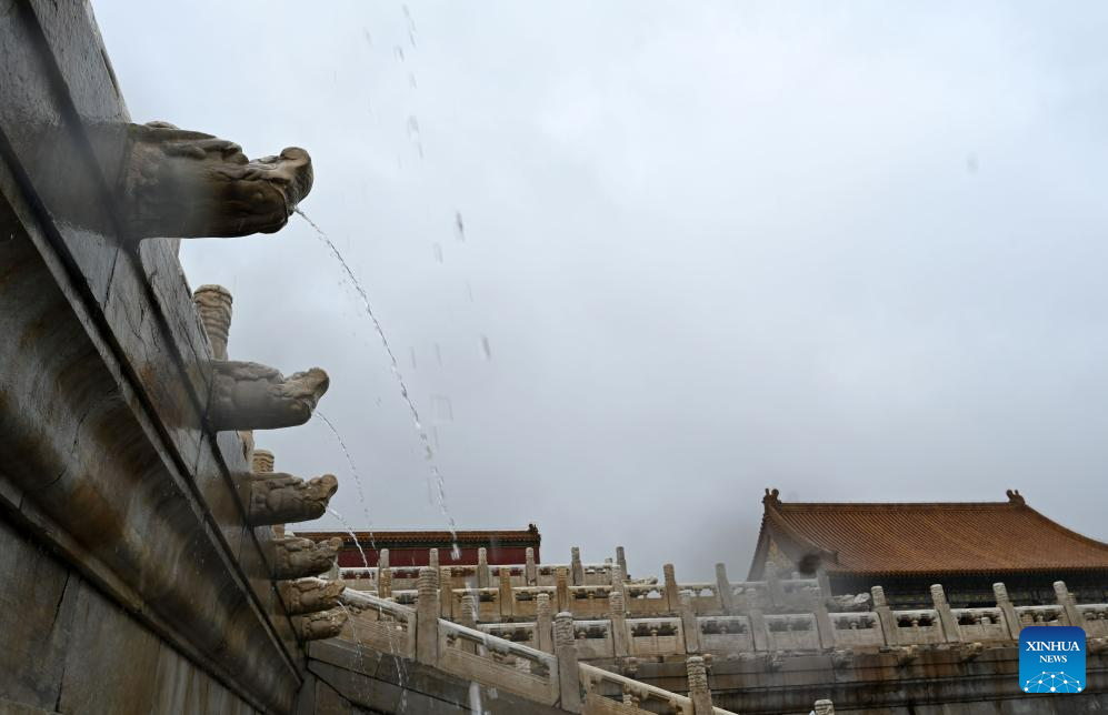 Rainwater is spilt from gargoyles in the shape of Chi, a legendary dragon in Chinese culture, inside the Forbidden City in Beijing, capital of China, July 31, 2023. As the city of Beijing was hit by rainstorms in recent days, the Forbidden City remained free of flooding thanks to the sound drainage system.