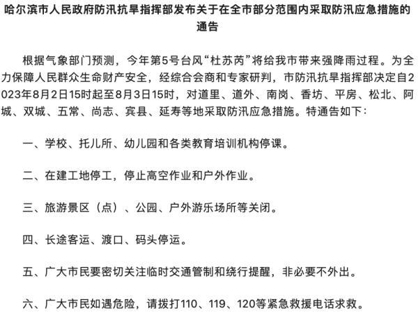 8月2日下午,“哈尔滨发布”微信公众号发布《哈尔滨市人民政府防汛抗旱指挥部发布关于在全市部分范围内采取防汛应急措施的通告》,称根据气象部门预测,今年第5号台风“杜苏芮”将给哈尔滨市带来强降雨过程,决定自2023年8月2日15时起至8月3日15时,对部分地区采取防汛应急措施,包括停工停课、关闭景点,户外游乐场等,并要求市民非必要不外出,长途客运、渡口、码头停运。