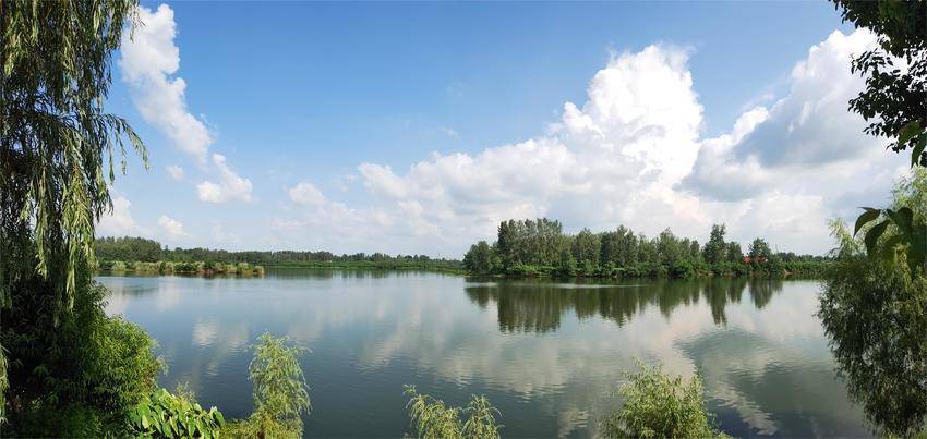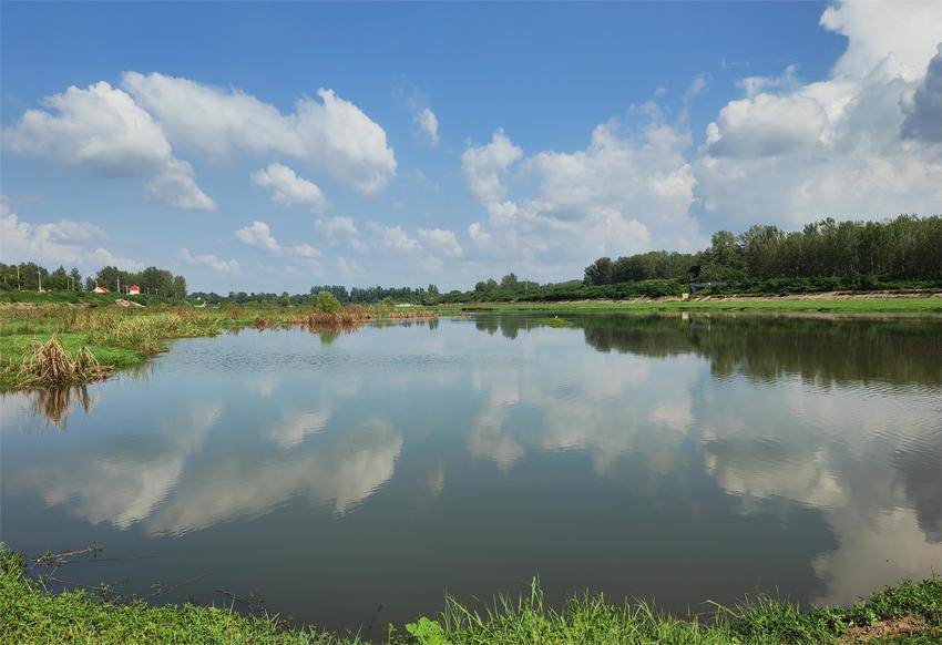 半亩方塘一鉴开,天光云影共徘徊。这里是滚河一处支流,垂柳依依,绿洲茵茵,清风徐来,水波不兴。