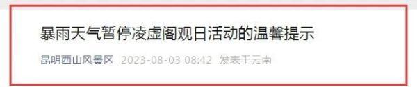 8月3日,昆明西山风景区发布暴雨天气暂停凌虚阁观日活动的温馨提示,详情如下: