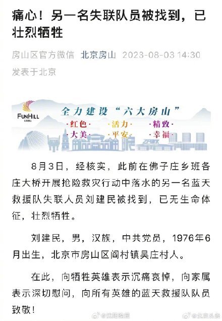 据北京房山消息,8月3日,经核实,此前在佛子庄乡班各庄大桥开展抢险救灾行动中落水的另一名蓝天救援队失联人员刘建民被找到,已无生命体征,壮烈牺牲。
