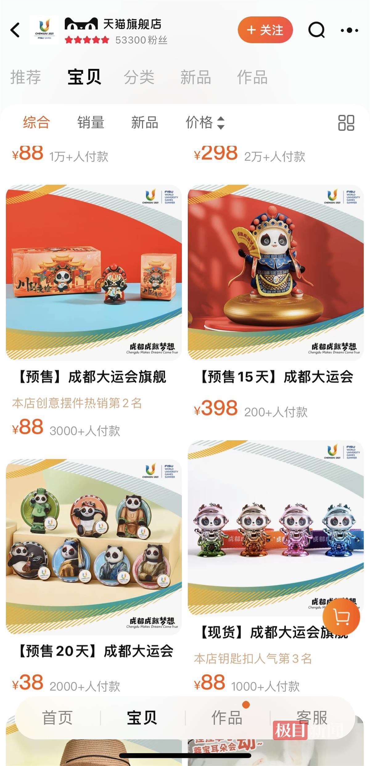 “这个徽章还有吗?”“‘蓉宝’摆件还有多少货?”在成都当地商店,不少热门产品一上架便一抢而空。极目新闻记者在淘宝成都大运会官方旗舰店看到,各种各样的“蓉宝”现货并不多,大多预售期在10天-30天不等。预售期为15天的川剧变脸蓉宝吉祥物手办摆件熊猫,月销售3万+,价格为298元。不少已经收到吉祥物的购物者表示,“这只脑门上印着金沙太阳神鸟的四川大熊猫,融入了川剧绝技变脸、吐火,妥妥的成都元素,必须点赞!”