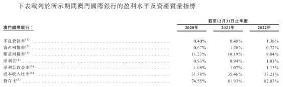 截至2020年、2021年及2022年12月31日,厦门国际投资的不良贷款率分别为0.40%、0.61%、1.38%,集友银行的不良贷款率分别为0.39%、0.80%、1.38%,澳门国际银行的不良贷款率分别为0.40%、0.48%、1.38%。