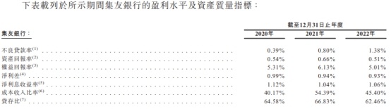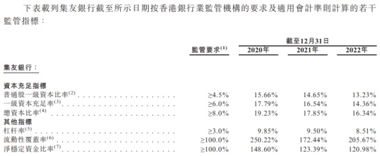 按香港银行业监管机构的要求及适用会计准则计算,截至2020年、2021年及2022年12月31日,集友银行的普通股一级资本比率分别为15.66%、14.65%、13.23%,一级资本充足率分别为17.79%、16.54%、14.36%,总资本比率分别为19.23%、17.85%、16.34%。