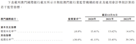 按澳门银行业监管机构的要求及适用会计准则计算,截至2020年、2021年及2022年12月31日,澳门国际银行的总资本比率分别为13.61%、13.62%、14.67%。