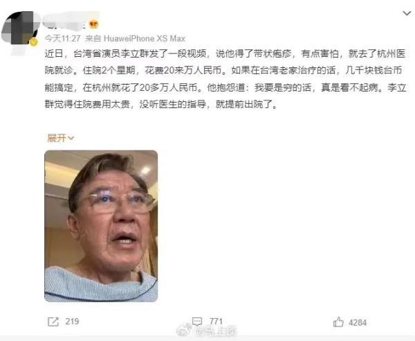 近日,台湾省演员李立群发了一段视频,说他得了带状疱疹,有点害怕,就去了杭州医院就诊。住院2个星期,花费20来万人民币。他抱怨道:我要是穷的话,真是看不起病。李立群觉得住院费用太贵,没听医生的指导,就提前出院了。
