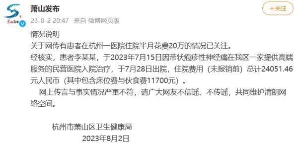 据浙江省杭州市萧山区人民政府新闻办公室官方微博@萧山发布8月2日晚消息,萧山区卫生健康局发布情况说明,回应网传有患者在杭州一医院住院半月花费20万的情况。