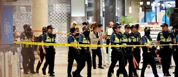 8月3日,韩国京畿道城南市一地铁站附近发生持刀行凶事件,警方封锁现场 图源:韩联社报道配图