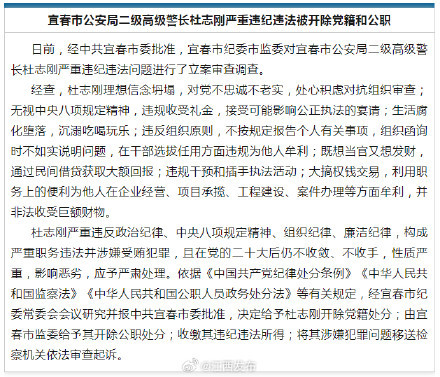【宜春市公安局二级高级警长杜志刚严重违纪违法被开除党籍和公职】(廉洁江西)