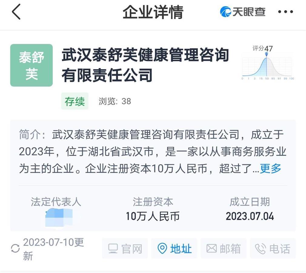 同时,天眼查信息还显示,武汉泰舒芙健康管理咨询有限责任公司成立于今年7月,为合肥泰舒芙健康管理咨询有限公司的全资子公司,经营范围包括养生保健服务(非医疗)、生活美容服务、足浴服务等。
