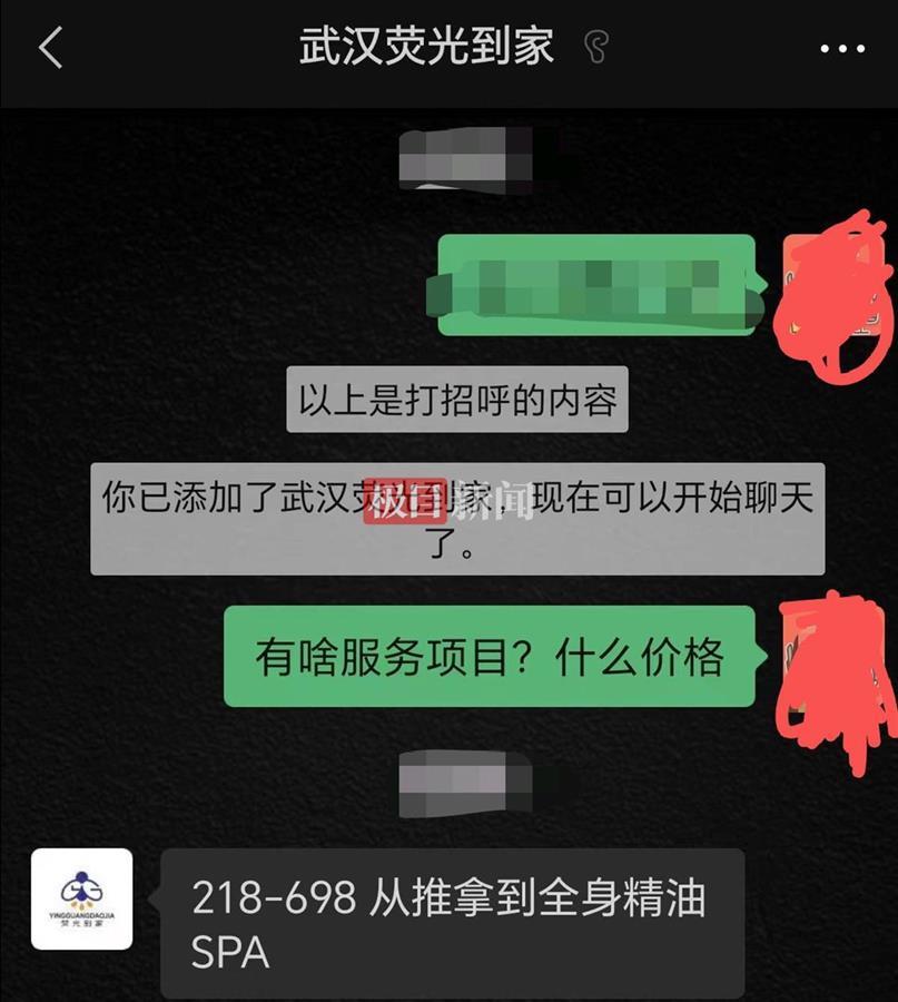 记者换了一部手机用微信询问“武汉荧光到家”有什么服务项目、什么价格,对方回复称218元到698元从推拿到全身精油SPA。