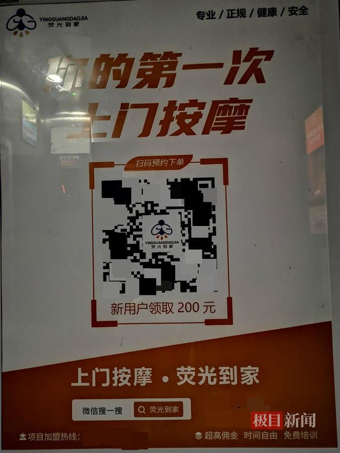 7月18日中午,极目新闻记者来到龙江庭苑小区A区,随意挑选了小区的3号楼查看,发现楼道里只有一部电梯。等电梯到一楼,随着电梯门徐徐打开,首先映入眼帘的就是“你的第一次上门按摩”几个大字和一个扫码下单二维码,二维码中间有一个很奇怪的图案。