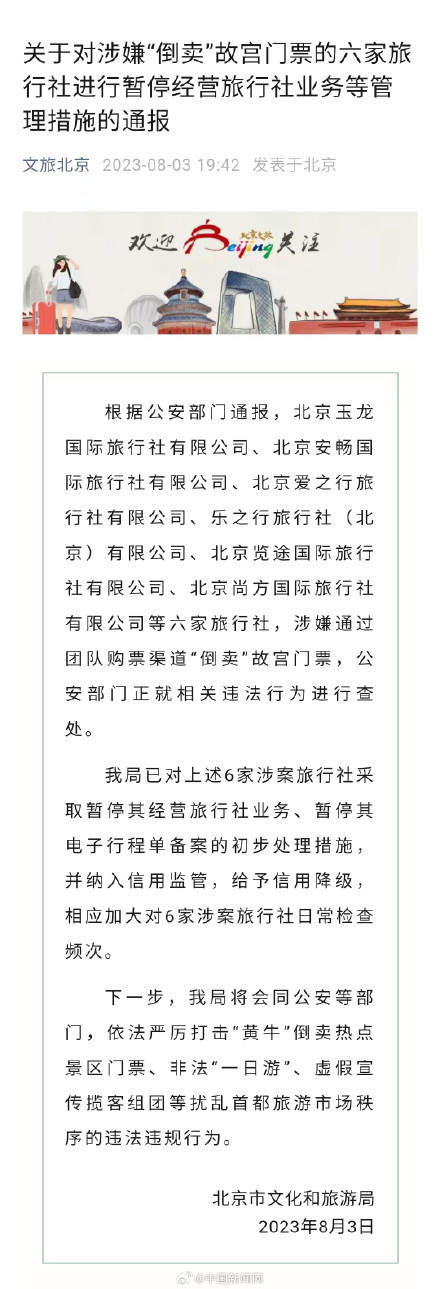 北京市文化和旅游局3日发布消息:根据公安部门通报,北京玉龙国际旅行社有限公司、北京安畅国际旅行社有限公司、北京爱之行旅行社有限公司、乐之行旅行社(北京)有限公司、北京览途国际旅行社有限公司、北京尚方国际旅行社有限公司等六家旅行社,涉嫌通过团队购票渠道“倒卖”故宫门票,公安部门正就相关违法行为进行查处。文旅局已对上述6家涉案旅行社采取暂停其经营旅行社业务、暂停其电子行程单备案的初步处理措施,并纳入信用监管,给予信用降级,相应加大对6家涉案旅行社日常检查频次。(文旅北京)