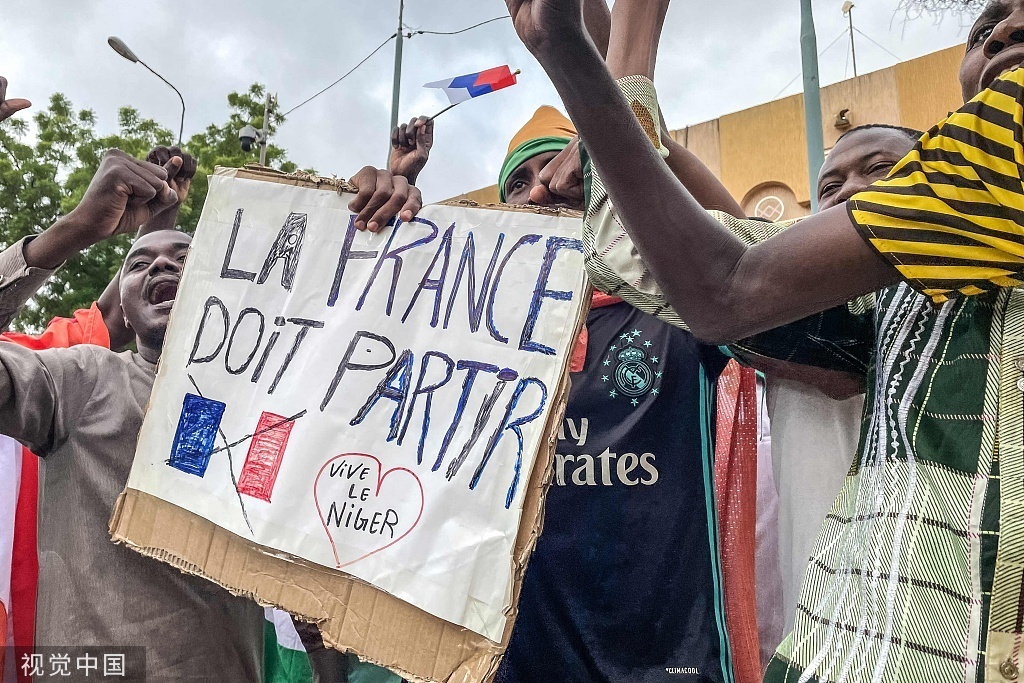 当地时间2023年8月3日,尼日尔尼亚美,抗议者在示威活动中举着反法国的标语牌。(视觉中国)