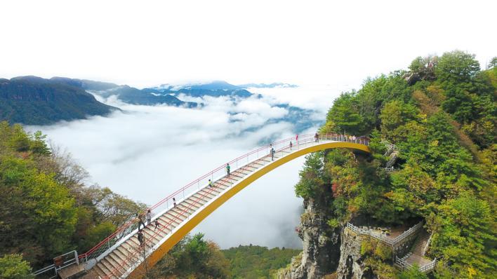 入夏以来,凭借21℃的清凉夏天,神农架成为让人心驰神往的避暑胜地,吸引省内外众多游客前来避暑纳凉。图为游客在海拔2200米的天燕彩虹桥欣赏云海。 (选自 湖北日报客户端神农架频道 作者 喻玲 刘晓麟)