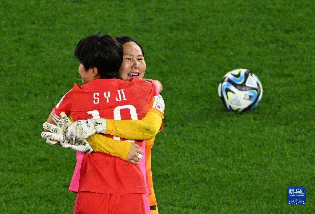 8月3日,韩国队守门员金正美(后)与队友池笑然拥抱。新华社记者 李一博 摄