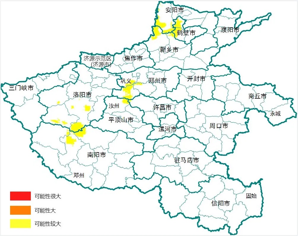 郑州荥阳市、新密市、登封市、巩义市,洛阳洛宁县、嵩县、栾川县,平顶山宝丰县、汝州市,安阳林州市,鹤壁鹤山区、山城区、淇滨区、淇县,新乡辉县市、卫辉市,许昌禹州市,南阳西峡县、南召县、内乡县,发生地质灾害的可能性较大。