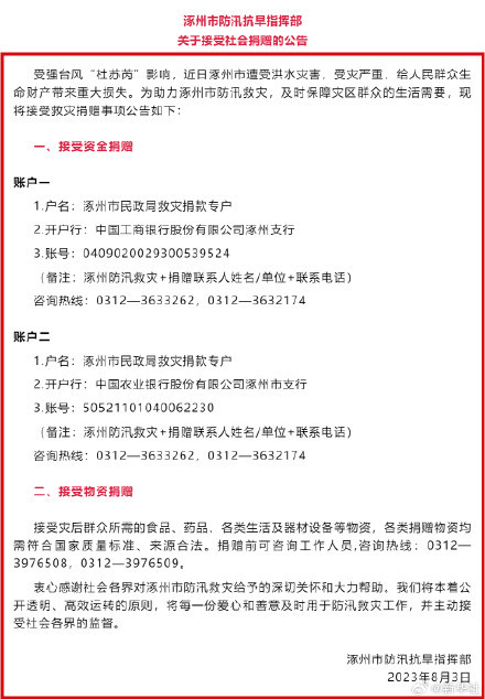 涿州市防汛抗旱指挥部发布:受强台风“杜苏芮”影响,近日涿州市遭受洪水灾害,受灾严重,给人民群众生命财产带来重大损失。为助力涿州市防汛救灾,及时保障灾区群众的生活需要,河北涿州面向社会接受资金物资捐赠。