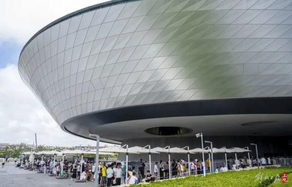 8月2日早上8点半,馆前已经排起了两条长长的队伍,一条是预订成功等待入场的观众队伍,一条是等待“捡漏”现场购票入场的观众。