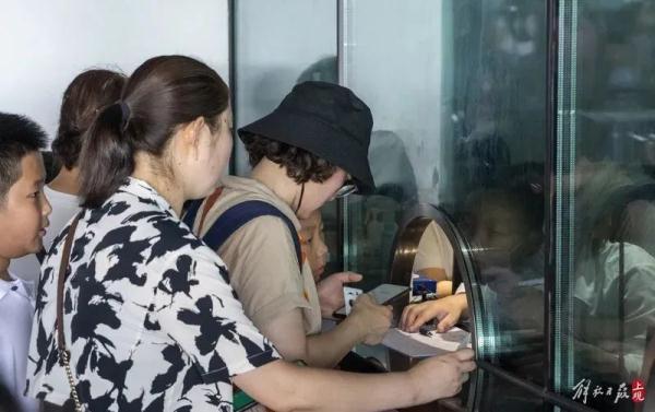入口旁的补票窗口,赶早班地铁来的辽宁游客单女士买到了现场票,如愿带着孩子进馆参观。
