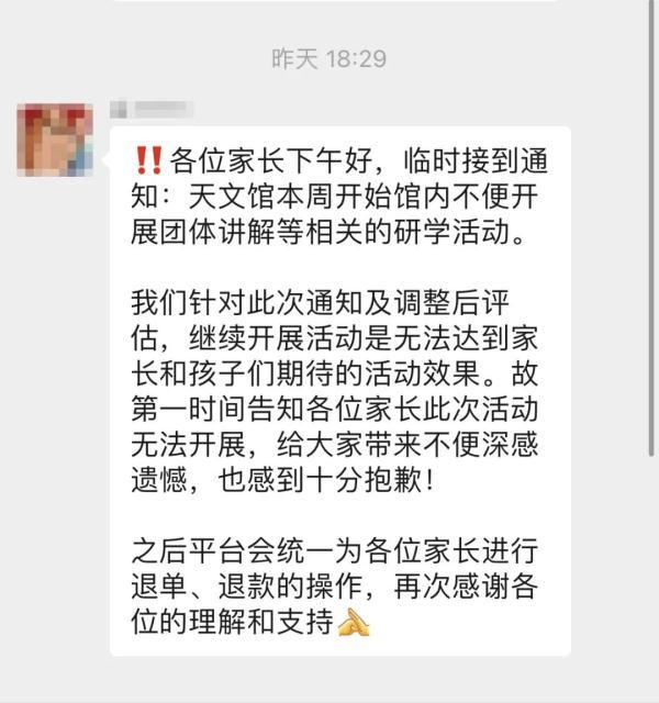 没想到8月2日傍晚,该研学营客服突然发出群公告称:临时接到通知,天文馆本周开始馆内不便开展团体讲解等相关的研学活动……最终,该营退单、退款。