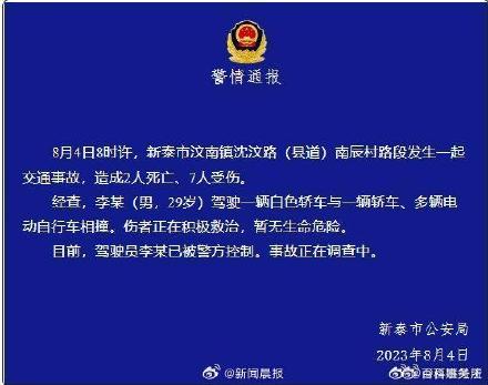 据新泰公安消息:8月4日8时许,新泰市汶南镇沈汶路(县道)南辰村路段发生一起交通事故,造成2人死亡、7人受伤。经查,李某(男,29岁)驾驶一辆白色轿车与一辆轿车、多辆电动自行车相撞。伤者正在积极救治,暂无生命危险。目前,驾驶员李某已被警方控制。事故正在调查中。