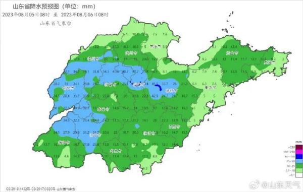5日白天到夜间,全省天气阴有中到大雨局部暴雨并伴有雷电。南风转北风3~4级,雷雨地区雷雨时阵风8~10级。夜间最低气温:全省一般在25°C左右。最高气温:聊城、菏泽、济宁、枣庄、鲁中和半岛内陆地区35~36°C,其他地区33°C左右。