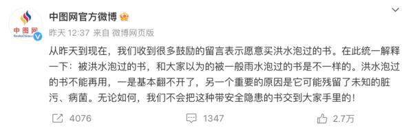 中图网员工@图不秃斯基也称,洪水浸泡的书籍可能有未知的脏污,中图网目前没有足够的清洁翻新消毒条件,不会将未经处理的泡水书递到读者手中的。“不要再想泡水书啦!”